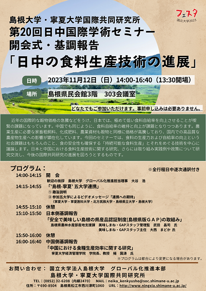 近年の国際的な穀物価格の急騰などをうけ、日本では、極めて低い食料自給率を向上させることが喫緊の課題になっています。中国でも同じように、食料自給率の維持と向上が課題となりつつあります。農業生産に必要な家畜粗飼料、化成肥料、農業資材も穀物と同様に価格が高騰しており、国内での高品質な農産物生産への影響が顕在化しています。今回のセミナーでは、食料の生産力および自給率の向上という社会課題はもちろんのこと、食の安全性も確保する「持続可能な食料生産」とそれをめぐる技術を中心に議論します。日本と中国における食料生産技術に関する研究、さらには取り組み実践例や政策について研究交流し、今後の国際共同研究の進展を図ろうとするものです。