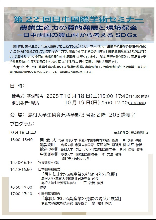 この度,下記の日程にて第22回日中国際学術セミナー(島根大学・寧夏大学国際共同研究所主催)を開催いたします。