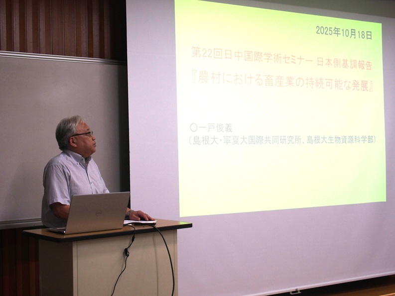 その後の基調報告では、日中双方の畜産業の現状について報告が行われました。日本側からは、本研究所の一戸俊義所長が、「農村における畜産業の持続可能な発展」というタイトルで、島根県における畜産業の現状について、実施している研究の結果等について報告しました。中国側からは、「寧夏における畜産業の発展の現状と展望」というタイトルで、寧夏大学動物科技学院副学院長の徐暁鋒教授より寧夏自治区の畜産業の現況についてご報告いただきました。